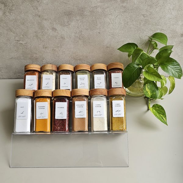 پک ادویه تکونی 18 عددی درب چوبی (ادویه) شامل : 18 عدد شیشه مک کارتی 12 سانت با ادویه و سری ادویه پاش:نمک ، ادویه مرغ ،ماست و دوغ ، نعنا ،فلفل سیاه ،فلفل قرمز،زنجبیل ،سماق ،دارچین ،زرچوبه ،پودرسیر ،پولبیبر،پودر آویشن،پودر پیاز ادویه کاری ،پاپریکا،ادویه خورشتی ،ادویه سالاد ، 3 عدد نظم دهنده ایرانی