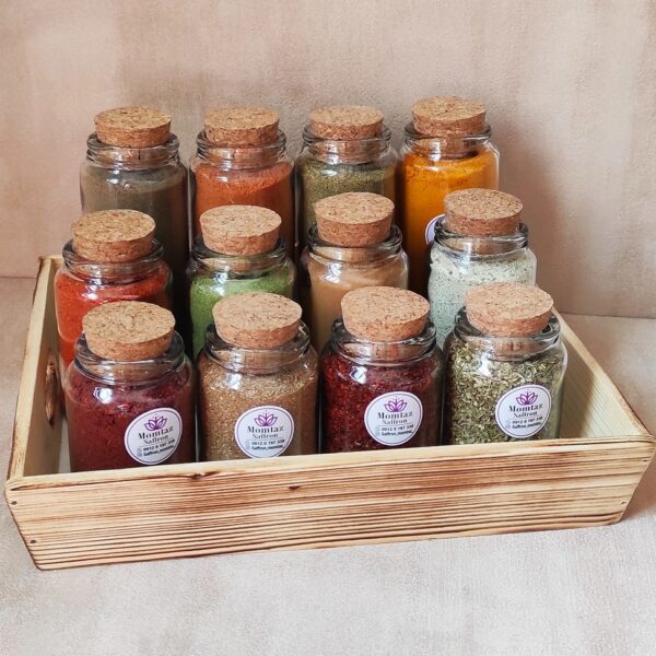 پک مخصوص کدبانو با محصولات شامل:یک عدد شیشه آلپ 15 سانت زردچوبه،یک عدد شیشه آلپ 15 سانت چاشنی سالاد فصل،یک عدد شیشه آلپ 15 سانت پوددر گوجه فرنگی،یک عددد شیشه آلپ 15 سانت فلفل سیاه،یک عدد شیشه آلپ 10 سانت پیاز جعفری،یک عدد شیشه آلپ 10 سانت دارچین،یک عدد شیشه آلپ 10 سانت پاپریکا،یک عدد شیشه آلپ 10 سانت نعنا،یک عدد شیشه آلپ 8 سانت پودر لیمو عمانی،یک عدد شیشه آلپ 8 سانت اورگانو،یک عدد شیشه آلپ 8 سانت پولبیبر،یک عدد شیشه آلپ 8 سانت سماق قرمز(شیشه ها همراه با کنف هستند)